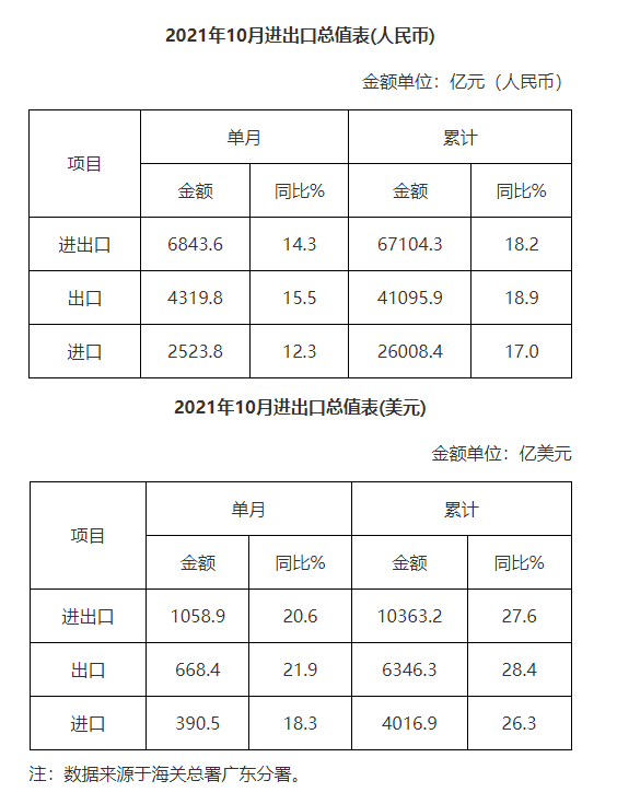 廣東省外貿(mào)進出口總值表(2021年10月)
