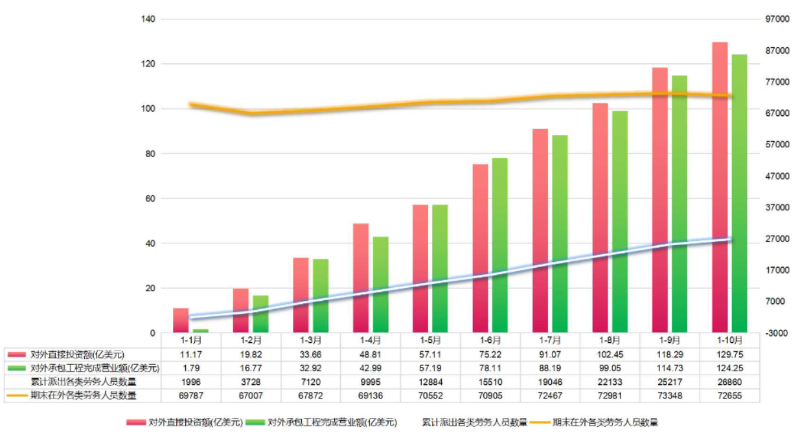 2021年1-10月,我省對(duì)外非金融類直接投資額129.75億美元,同比下降4.4%。對(duì)外承包工程完成營(yíng)業(yè)額124.25億美元,勞務(wù)項(xiàng)下和工程項(xiàng)下累計(jì)派出各類勞務(wù)人員26860人,期末在外各類勞務(wù)人員72655人。