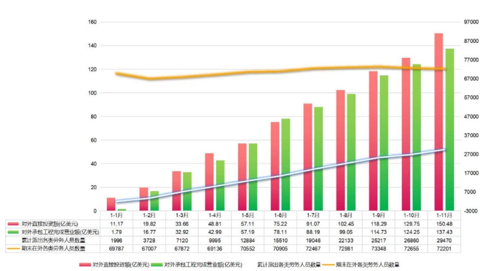 2021年1-11月,我省對外非金融類直接投資額150.48億美元,同比增長4.37%。對外承包工程完成營業(yè)額137.43億美元,勞務(wù)項(xiàng)下和工程項(xiàng)下累計(jì)派出各類勞務(wù)人員29470人,期末在外各類勞務(wù)人員72201人。