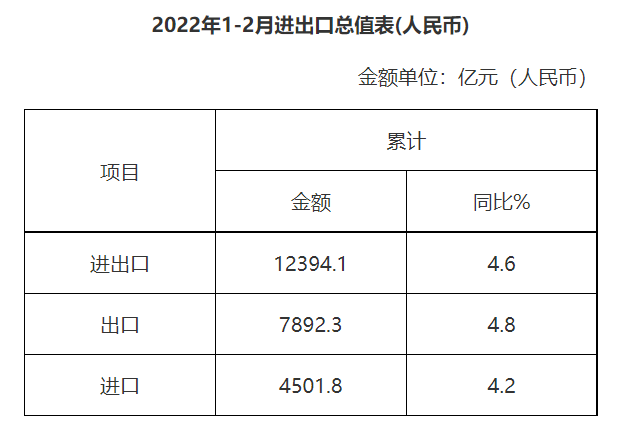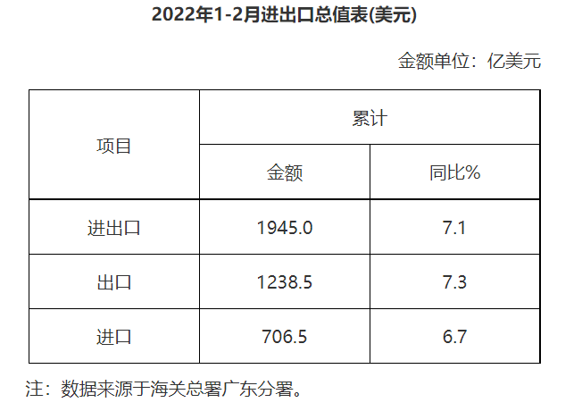 廣東省外貿(mào)進出口總值表(2022年1-2月)
