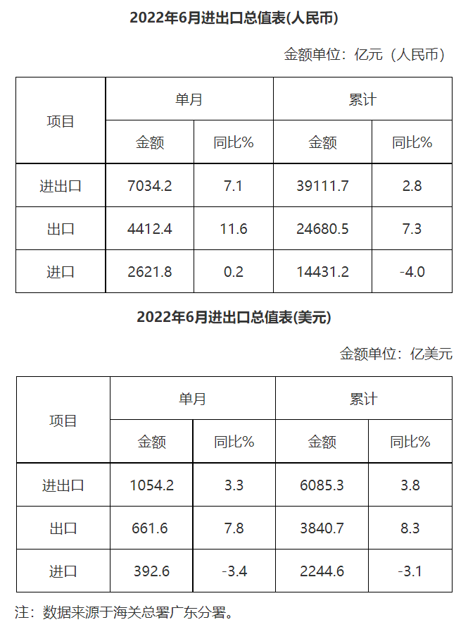 廣東省外貿(mào)進(jìn)出口總值表(2022年6月)