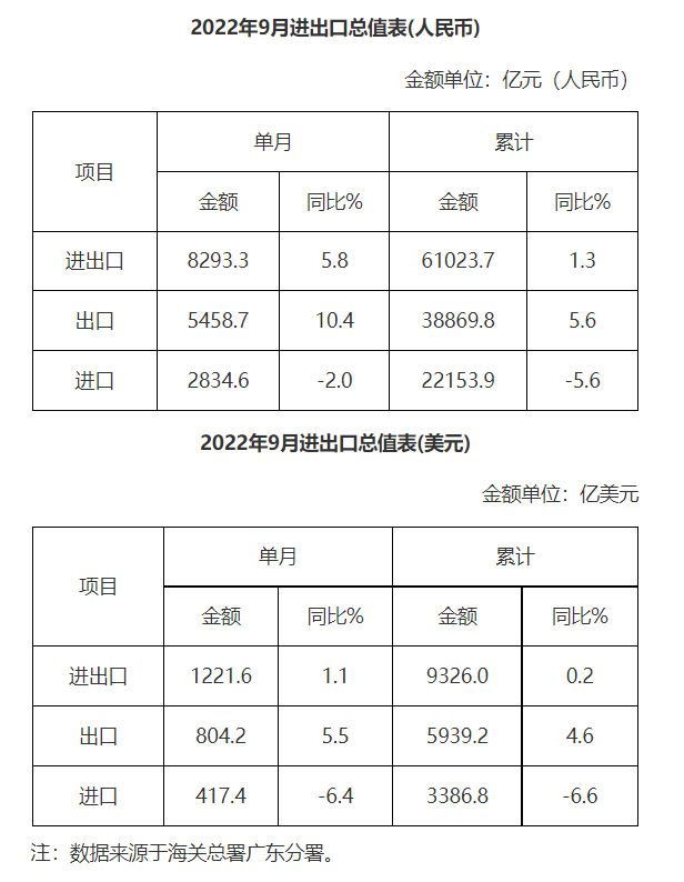廣東省外貿(mào)進(jìn)出口總值表(2022年9月)