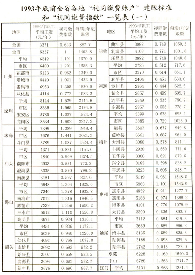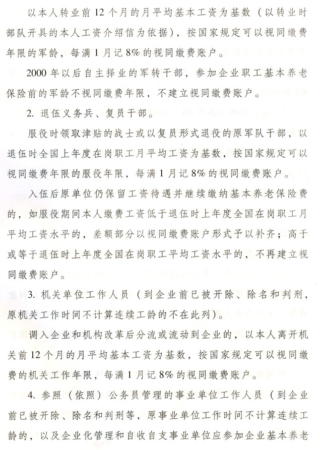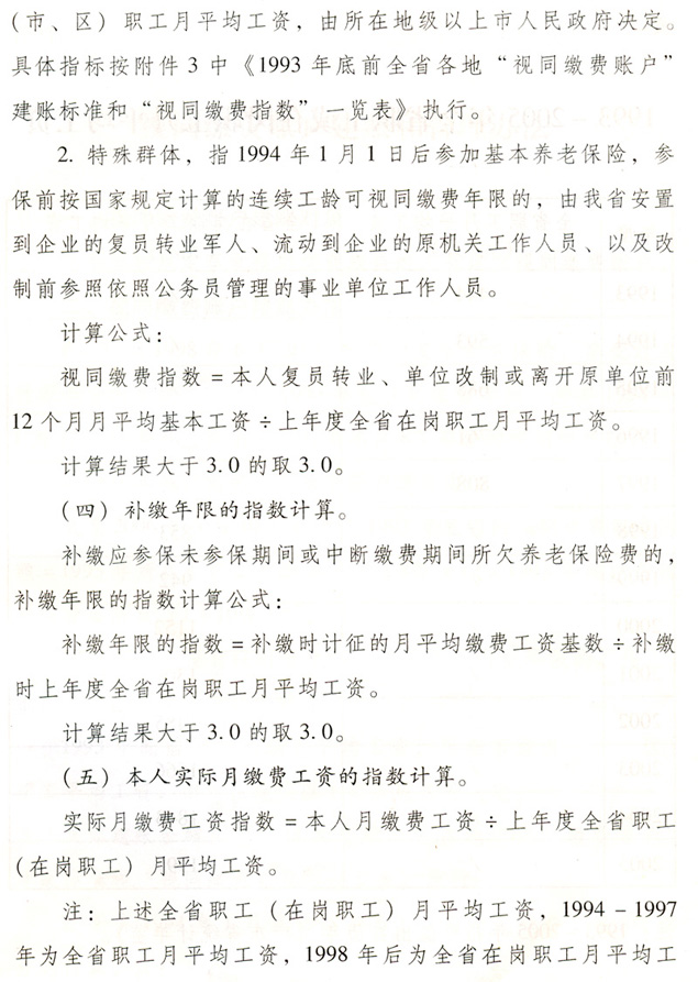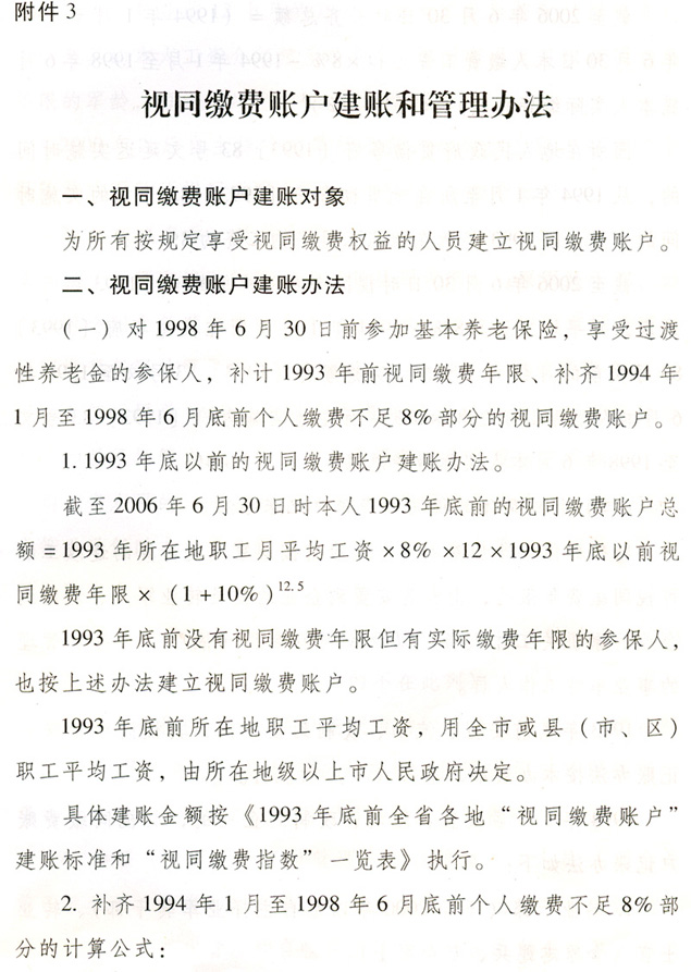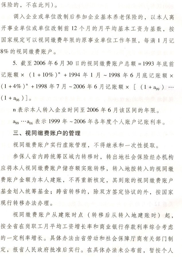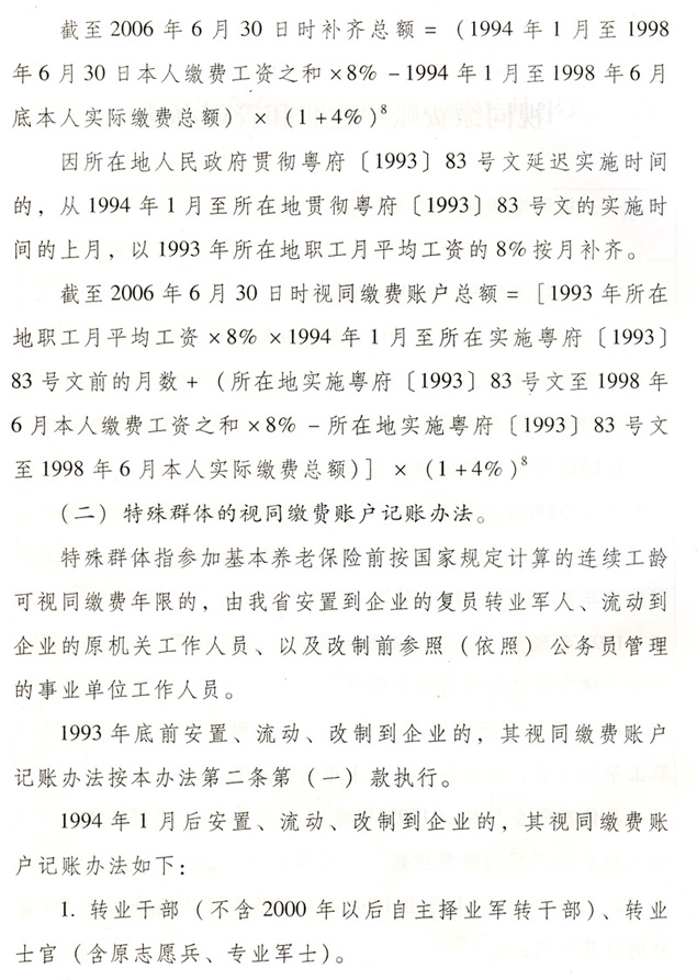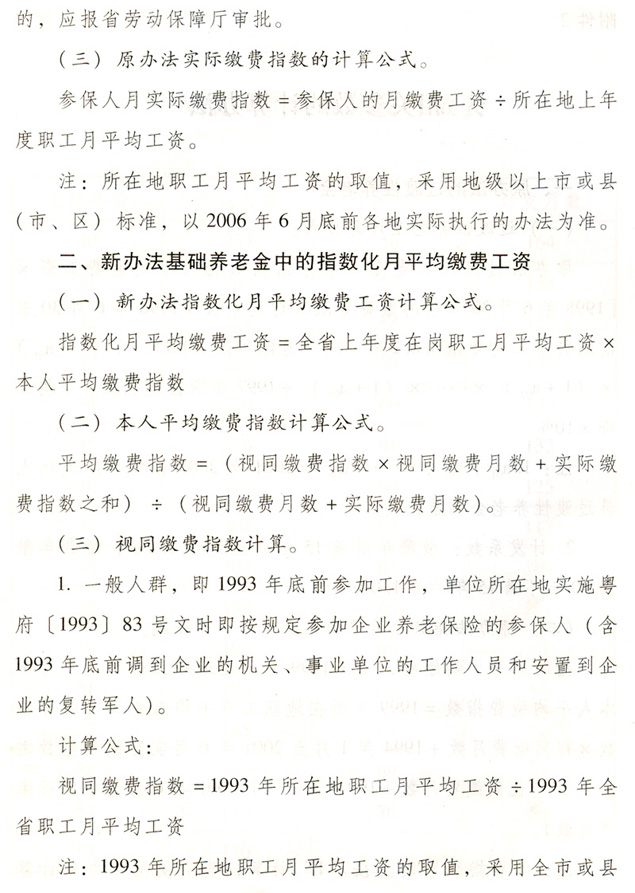關(guān)于貫徹國務(wù)院完善企業(yè)職工基本 養(yǎng)老保險(xiǎn)制度決定的通知 各地級以上市人民政府,各縣(市、區(qū))人民政府,省政府各部門、各直屬機(jī)構(gòu): 為全面深入貫徹落實(shí)《國務(wù)院關(guān)于完善企業(yè)職工基本養(yǎng)老保險(xiǎn)制度的決定》(國發(fā)〔2005〕38號),進(jìn)一步推進(jìn)廣東省社會保障體系建設(shè),決定自2006年7月1日起調(diào)整完善廣東省企業(yè)職工基本養(yǎng)老保險(xiǎn)制度,現(xiàn)就有關(guān)工作通知如下: 一、調(diào)整個(gè)人賬戶記賬規(guī)模 從2006年7月1日起,統(tǒng)一將全省企業(yè)職工基本養(yǎng)老保險(xiǎn)個(gè)人賬戶規(guī)模從本人繳費(fèi)工資的11%調(diào)整為8%。2006年6月30日前的個(gè)人賬戶與2006年7月1日后的個(gè)人賬戶合并計(jì)算。 各地要做好清理審核調(diào)整前后的個(gè)人賬戶數(shù)據(jù)和個(gè)人賬戶記錄工作,實(shí)現(xiàn)個(gè)人賬戶的規(guī)范化管理。 二、調(diào)整養(yǎng)老保險(xiǎn)繳費(fèi)基數(shù) 個(gè)人繳費(fèi)以參保人月應(yīng)稅工資、薪金收入為基數(shù)。參保人月應(yīng)稅工資、薪金高于全省上年度在崗職工月平均工資300%的,以全省上年度在崗職工月平均工資的300%為繳費(fèi)基數(shù);參保人月應(yīng)稅工資、薪金收入低于全省上年度在崗職工月平均工資60%的,以全省上年度在崗職工月平均工資的60%為繳費(fèi)基數(shù)。 參保人所在市(地級以上市,下同)上年度在崗職工月平均工資低于全省上年度在崗職工月平均工資,且本人月應(yīng)稅工資、薪金低于全省上年度在崗職工月平均工資60%的,可按不低于所在市上年度在崗職工月平均工資的60%為繳費(fèi)基數(shù),以后逐步過渡到以全省上年度在崗職工月平均工資的60%為繳費(fèi)基數(shù)。 城鎮(zhèn)個(gè)體工商戶和靈活就業(yè)人員,原則上以全省上年度在崗職工月平均工資為繳費(fèi)基數(shù)。所在市上年度在崗職工月平均工資低于全省上年度在崗職工月平均工資的,也可從所在市上年度在崗職工月平均工資的60%起步,逐步過渡到全省上年度在崗職工月平均工資。 經(jīng)申報(bào)并已核定的2006年6月底前的繳費(fèi)基數(shù)不再重新核定。 三、改革基本養(yǎng)老金計(jì)發(fā)辦法 從2006年7月1日起,改革企業(yè)基本養(yǎng)老金計(jì)發(fā)辦法。2006年6月30日前已申領(lǐng)基本養(yǎng)老金的參保人,仍按原辦法計(jì)發(fā)基本養(yǎng)老金,同時(shí)執(zhí)行本通知規(guī)定的年度調(diào)整辦法。 (一)享受基本養(yǎng)老金的條件。 參保人符合下列條件之一的,可申請按月領(lǐng)取基本養(yǎng)老金: 1.1998年7月1日后參加基本養(yǎng)老保險(xiǎn),達(dá)到國家規(guī)定退休年齡,累計(jì)繳費(fèi)年限(含視同繳費(fèi)年限,下同)滿15年的; 2.1998年6月30日前參加基本養(yǎng)老保險(xiǎn),2013年6月30日前達(dá)到國家規(guī)定的退休年齡,累計(jì)繳費(fèi)年限滿10年的; 3.1998年6月30日前參加基本養(yǎng)老保險(xiǎn),2013年7月1日后達(dá)到國家規(guī)定的退休年齡,累計(jì)繳費(fèi)年限滿15年的; 41998年6月30日前應(yīng)參保未參保,1998年7月1日以后辦理參保補(bǔ)繳手續(xù),達(dá)到國家規(guī)定的退休年齡,累計(jì)繳費(fèi)年限滿15年的。 (二)基本養(yǎng)老金計(jì)發(fā)辦法。 1.1998年7月1日后參加基本養(yǎng)老保險(xiǎn)的參保人,基本養(yǎng)老金由基礎(chǔ)養(yǎng)老金和個(gè)人賬戶養(yǎng)老金組成。 ?。?)基礎(chǔ)養(yǎng)老金月標(biāo)準(zhǔn)為: 基礎(chǔ)養(yǎng)老金=(全省上年度在崗職工月平均工資+本人指數(shù)化月平均繳費(fèi)工資)÷2×繳費(fèi)年限(含視同繳費(fèi)年限)×1% 本人指數(shù)化月平均繳費(fèi)工資的計(jì)算辦法見附件2。 參保人指數(shù)化月平均繳費(fèi)工資低于全省上年度在崗職工月平均工資的60%的,基礎(chǔ)養(yǎng)老金月標(biāo)準(zhǔn)為: 基礎(chǔ)養(yǎng)老金=(全省上年度在崗職工月平均工資×a+本人指數(shù)化月平均繳費(fèi)工資)÷2×繳費(fèi)年限(含視同繳費(fèi)年限)×1% a=本人平均繳費(fèi)指數(shù)÷0.6,今后可隨廣東省區(qū)域經(jīng)濟(jì)發(fā)展情況進(jìn)行適當(dāng)調(diào)整。 基礎(chǔ)養(yǎng)老金從基本養(yǎng)老保險(xiǎn)統(tǒng)籌基金中支付。 (2)個(gè)人賬戶養(yǎng)老金月標(biāo)準(zhǔn)為: 以本人首次領(lǐng)取基本養(yǎng)老金時(shí)個(gè)人賬戶儲存額除以計(jì)發(fā)月數(shù),計(jì)發(fā)月數(shù)按國發(fā)〔2005〕38號文的規(guī)定執(zhí)行(見附件1)。個(gè)人賬戶養(yǎng)老金從本人個(gè)人賬戶基金中支付。 2.具有視同繳費(fèi)權(quán)益并建立了視同繳費(fèi)賬戶的下列參保人,在計(jì)發(fā)基礎(chǔ)養(yǎng)老金和個(gè)人賬戶養(yǎng)老金的基礎(chǔ)上,再計(jì)發(fā)過渡性養(yǎng)老金: ?。?)1998年6月30日前參加基本養(yǎng)老保險(xiǎn),2006年7月1日以后符合按月領(lǐng)取基本養(yǎng)老金條件的; ?。?)1998年7月1日后參加基本養(yǎng)老保險(xiǎn),參保前具有按國家規(guī)定的視同繳費(fèi)年限,2006年7月1日后符合按月領(lǐng)取基本養(yǎng)老金條件的。 3.首次領(lǐng)取的過渡性養(yǎng)老金月標(biāo)準(zhǔn)為: ?。?)1998年6月30日前參加基本養(yǎng)老保險(xiǎn)的,以首次領(lǐng)取基本養(yǎng)老金