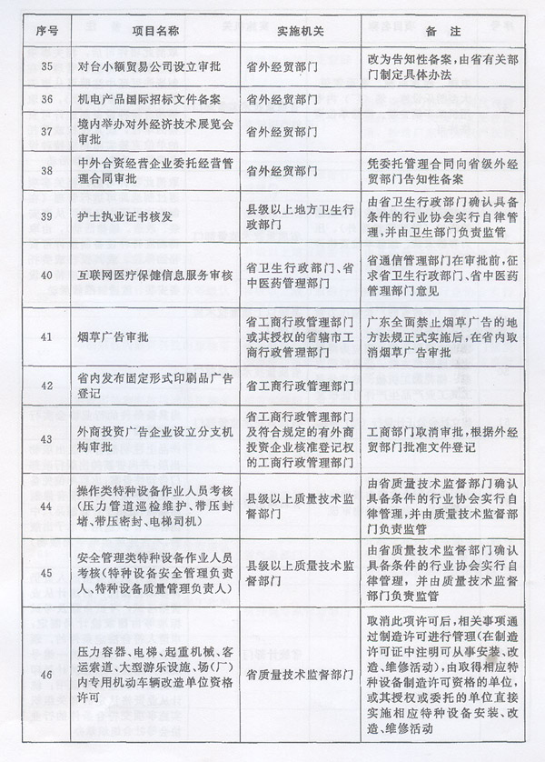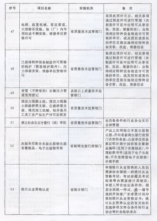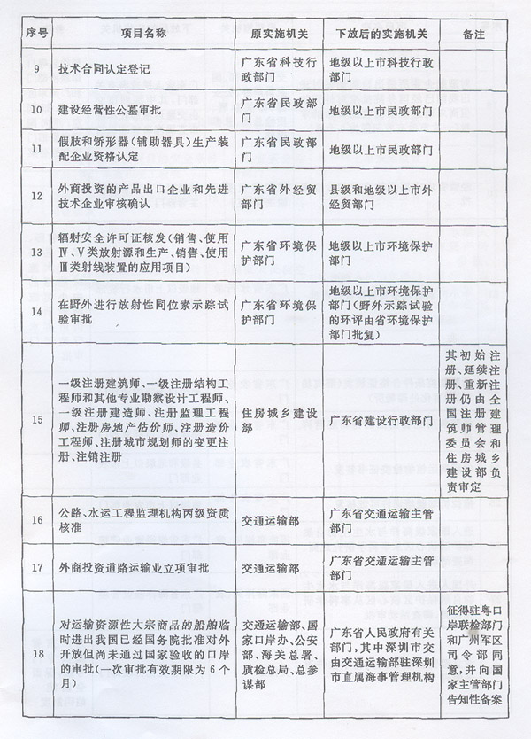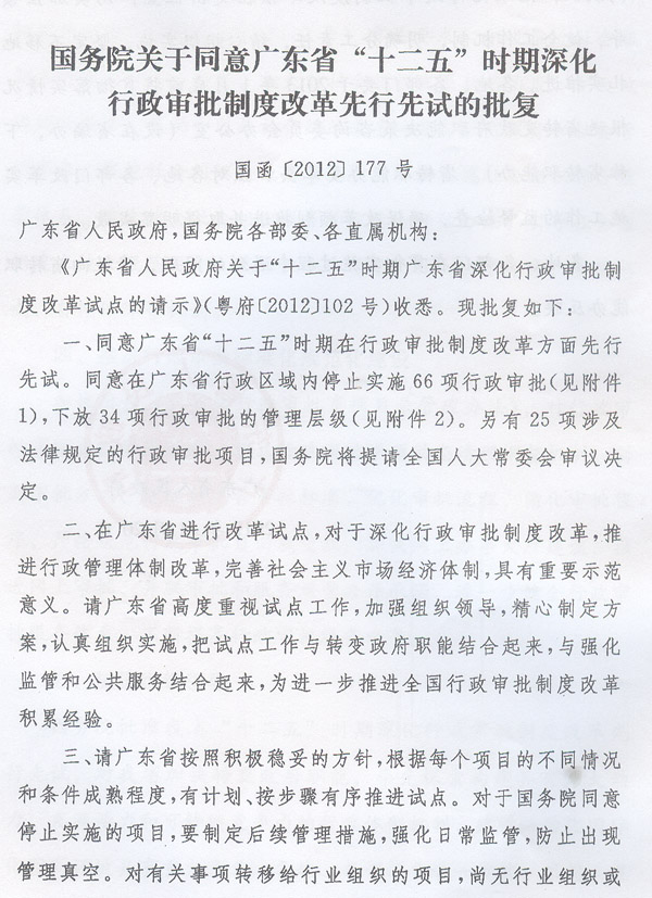 ? 廣東省人民政府轉(zhuǎn)發(fā)《國(guó)務(wù)院關(guān)于同意 廣東省“十二五”時(shí)期深化行政審批 制度改革先行先試的批復(fù)》的通知 ? 各地級(jí)以上市人民政府,各縣(市、區(qū))人民政府,省政府各部門(mén)、各直屬機(jī)構(gòu): 現(xiàn)將《國(guó)務(wù)院關(guān)于同意廣東省“十二五”時(shí)期深化行政審批制度改革先行先試的批復(fù)》(國(guó)函〔2012〕177號(hào))轉(zhuǎn)給你們,并結(jié)合我省實(shí)際提出以下意見(jiàn),請(qǐng)一并認(rèn)真貫徹執(zhí)行。 一、積極穩(wěn)妥做好實(shí)施工作 各地、各部門(mén)要結(jié)合當(dāng)前正在推進(jìn)的各級(jí)行政審批制度改革工作,抓緊制訂具體實(shí)施方案,明確實(shí)施時(shí)間、任務(wù)和進(jìn)度安排等,確保行政審批項(xiàng)目取消和調(diào)整工作及時(shí)落實(shí)到位。 (一)關(guān)于國(guó)務(wù)院同意在我省行政區(qū)域內(nèi)停止實(shí)施的行政審批事項(xiàng)。 對(duì)國(guó)務(wù)院同意在我省行政區(qū)域內(nèi)停止實(shí)施的行政審批事項(xiàng),原實(shí)施機(jī)關(guān)自本通知下發(fā)之日起停止實(shí)施,不得變相審批。 對(duì)國(guó)務(wù)院同意在我省行政區(qū)域內(nèi)政府部門(mén)不再實(shí)施、轉(zhuǎn)移給具備條件的行業(yè)組織實(shí)行自律管理的事項(xiàng),要根據(jù)國(guó)函〔2012〕177號(hào)文規(guī)定的具體內(nèi)容,結(jié)合省編委《政府向社會(huì)轉(zhuǎn)移職能工作方案》(粵機(jī)編〔2012〕22號(hào))有關(guān)要求,分類(lèi)分步轉(zhuǎn)移,積極穩(wěn)妥有序推進(jìn),確保相關(guān)事項(xiàng)“轉(zhuǎn)得出、接得穩(wěn)”。已經(jīng)具備條件的事項(xiàng),要立即實(shí)施轉(zhuǎn)移;基本具備條件的事項(xiàng),要制訂分步驟分階段工作安排,逐步實(shí)施轉(zhuǎn)移;暫不具備條件的事項(xiàng),要加快培育行業(yè)組織,設(shè)定一定過(guò)渡期并明確過(guò)渡期內(nèi)的管理安排。各部門(mén)要就每項(xiàng)轉(zhuǎn)移事項(xiàng)制訂實(shí)施方案,報(bào)本級(jí)機(jī)構(gòu)編制部門(mén)或行政審批制度改革牽頭部門(mén)審定。除需新成立行業(yè)組織后再實(shí)施轉(zhuǎn)移的事項(xiàng)外,其他轉(zhuǎn)移事項(xiàng)的交接工作爭(zhēng)取在2013年上半年基本完成。 ?。ǘ╆P(guān)于國(guó)務(wù)院同意下放管理層級(jí)的行政審批事項(xiàng)。 由國(guó)家部門(mén)下放到我省實(shí)施的行政審批事項(xiàng),各地、各部門(mén)要積極主動(dòng)與國(guó)家有關(guān)部門(mén)做好溝通銜接,爭(zhēng)取在2012年年底前完成交接工作,并在國(guó)家相關(guān)部門(mén)的指導(dǎo)下,依法開(kāi)展行政審批。 對(duì)國(guó)務(wù)院同意我省下放到市、縣實(shí)施的行政審批事項(xiàng),原實(shí)施機(jī)關(guān)要在2012年年底前與承接單位完成交接工作,并通過(guò)有效方式向社會(huì)公布交接日期、下放事項(xiàng)及權(quán)責(zé)關(guān)系等。在交接期間,原實(shí)施機(jī)關(guān)要繼續(xù)做好相關(guān)管理工作,防止交接過(guò)程中出現(xiàn)管理“真空”。原實(shí)施機(jī)關(guān)要加強(qiáng)對(duì)承接單位的業(yè)務(wù)培訓(xùn)和指導(dǎo),促進(jìn)承接單位依法依規(guī)有序開(kāi)展工作。行政審批事項(xiàng)下放后,實(shí)施機(jī)關(guān)為市、縣(市、區(qū))人民政府的,由市、縣(市、區(qū))人民政府確定具體實(shí)施部門(mén)。除另有規(guī)定外,佛山市順德區(qū)政府(部門(mén))享有下放給地級(jí)以上市政府(部門(mén))的權(quán)限。 二、切實(shí)加強(qiáng)監(jiān)管 在取消、調(diào)整行政審批事項(xiàng)的同時(shí),要努力改變重審批、輕監(jiān)管的管理方式,加快推動(dòng)政府部門(mén)工作重心向制訂標(biāo)準(zhǔn)規(guī)則和強(qiáng)化監(jiān)管轉(zhuǎn)移,管理方式由事前審批向事中、事后監(jiān)管轉(zhuǎn)變。各部門(mén)要根據(jù)省編委《關(guān)于加強(qiáng)對(duì)行政審批制度改革調(diào)整事項(xiàng)監(jiān)管的意見(jiàn)》(粵機(jī)編〔2012〕23號(hào))有關(guān)要求,結(jié)合社會(huì)信用體系建設(shè)和市場(chǎng)監(jiān)管體系建設(shè),針對(duì)取消、調(diào)整的行政審批事項(xiàng),逐項(xiàng)制訂具體監(jiān)管辦法,切實(shí)履行好后續(xù)監(jiān)管職責(zé),抓緊完善各領(lǐng)域、各環(huán)節(jié)的監(jiān)管制度和管理規(guī)范,強(qiáng)化監(jiān)管責(zé)任,落實(shí)監(jiān)管措施,防止監(jiān)管缺位。 三、加快培育發(fā)展和規(guī)范社會(huì)組織 按照省委、省政府《關(guān)于進(jìn)一步培育發(fā)展和規(guī)范管理社會(huì)組織的方案》(粵發(fā)〔2012〕7號(hào))有關(guān)要求,積極推進(jìn)社會(huì)組織去行政化和去壟斷化,加大對(duì)社會(huì)組織發(fā)展扶持力度,擴(kuò)大政府購(gòu)買(mǎi)服務(wù),鼓勵(lì)和引導(dǎo)社會(huì)組織更多地參與社會(huì)服務(wù)和社會(huì)管理事務(wù),促進(jìn)社會(huì)組織良性有序發(fā)展。加快構(gòu)建社會(huì)組織綜合監(jiān)管體系,建立健全社會(huì)組織服務(wù)管理能力評(píng)估辦法,引導(dǎo)社會(huì)組織建立健全規(guī)范運(yùn)作、誠(chéng)信執(zhí)業(yè)、信息公開(kāi)、公平競(jìng)爭(zhēng)、