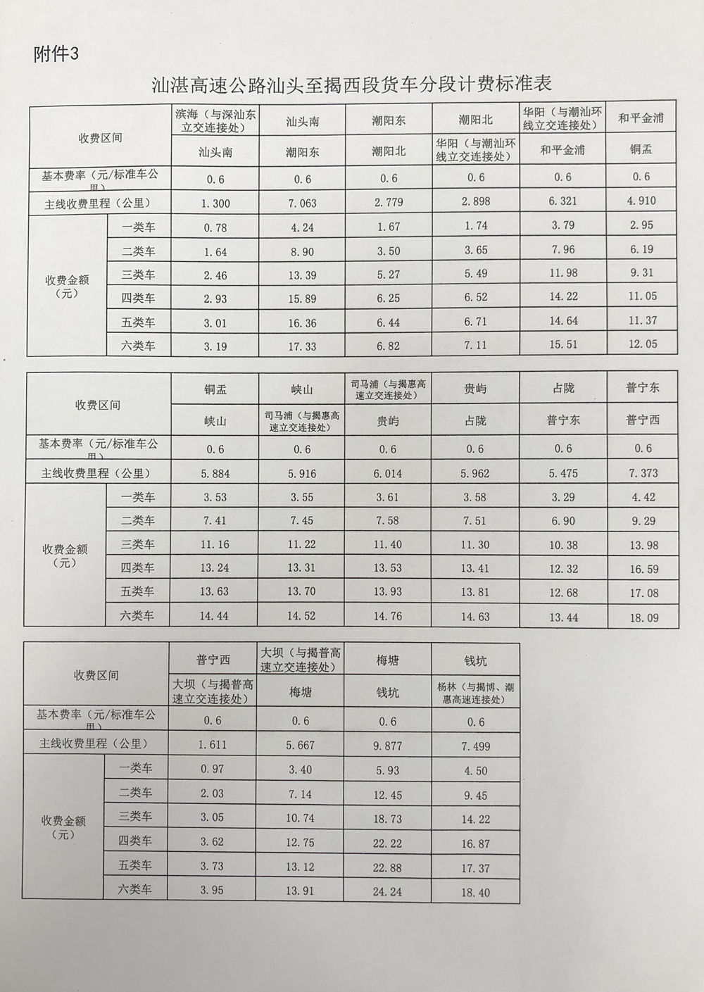 3.汕湛高速公路汕頭至揭西段貨車分段計(jì)費(fèi)標(biāo)準(zhǔn)表